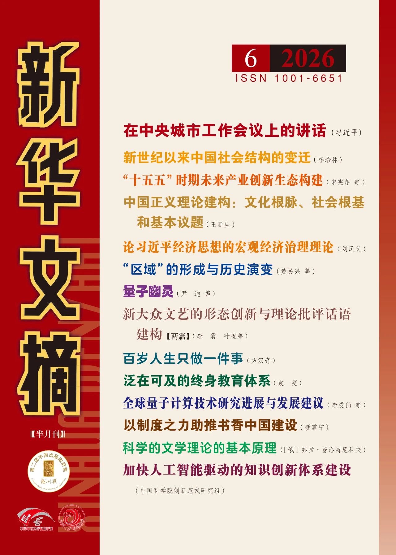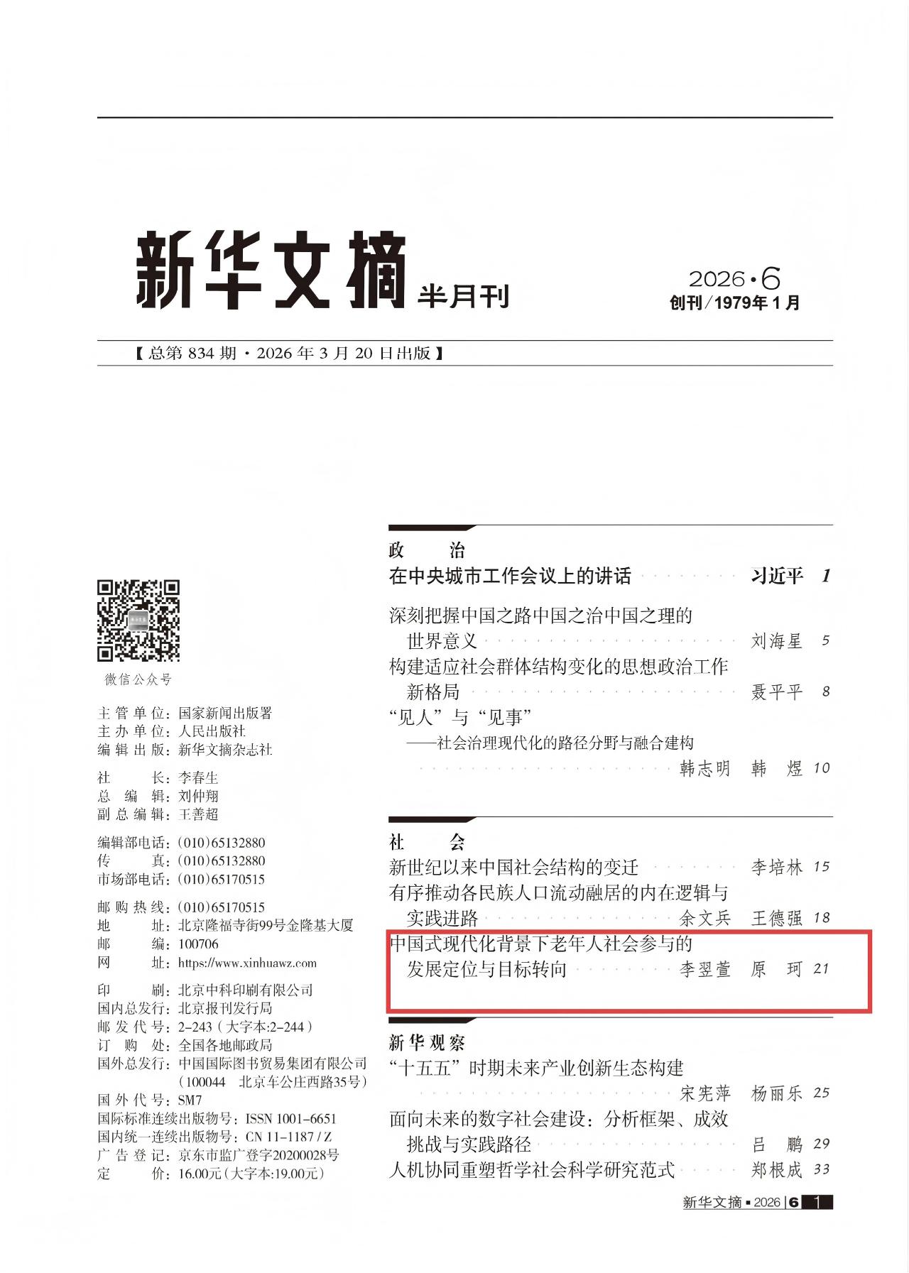 近日,内蒙古大学民族学与社会学学院李翌萱副教授与对外经济贸易大学政府管理学院原珂教授撰写的《中国式现代化背景下老年人社会参与的发展定位与目标转向》一文被《新华文摘》2026年第6期全文转载,该文原发表于《治理现代化研究》2025年第5期。