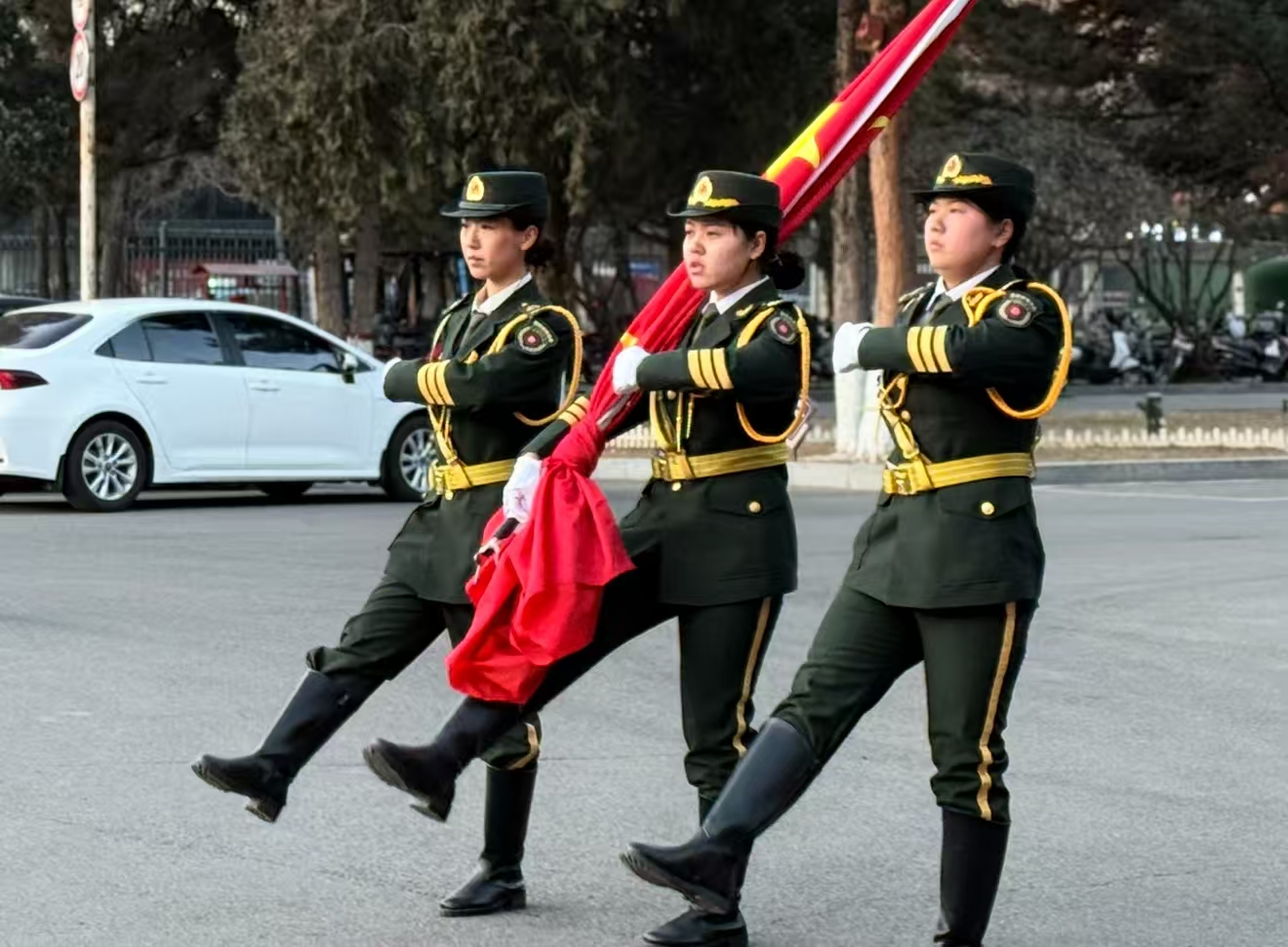 迎着微风,向着朝阳,护送国旗的同学们目光坚定、步伐整齐。国旗升起,国歌奏响,同学们注目行礼、歌唱国歌,传达着对祖国的尊重与热爱。